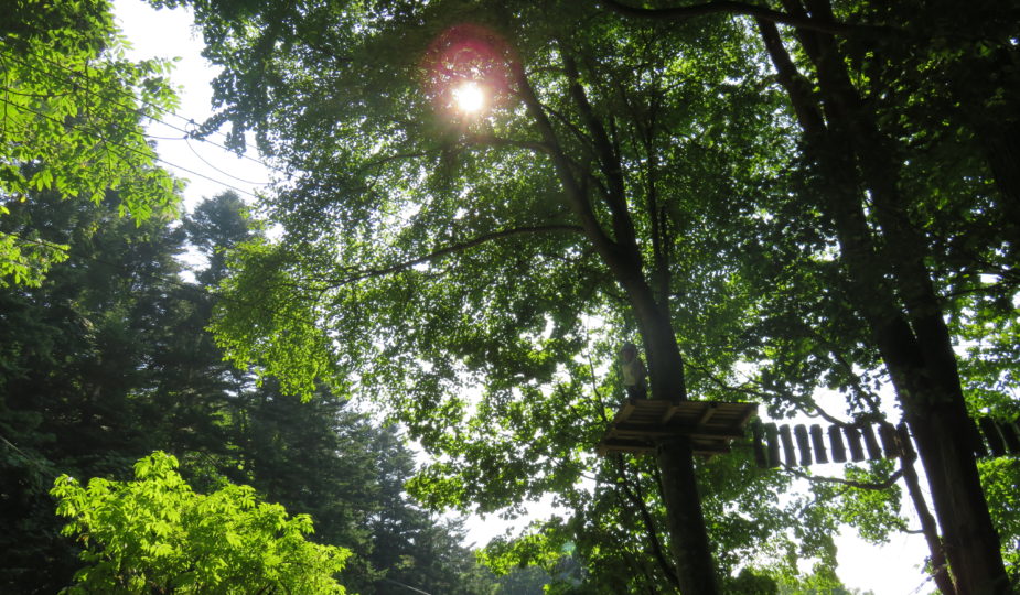 ツリートレッキングは木と木の間を細い板や、ロープや、はしごなどスリリングなところを通り進んでいくアスレチックです。